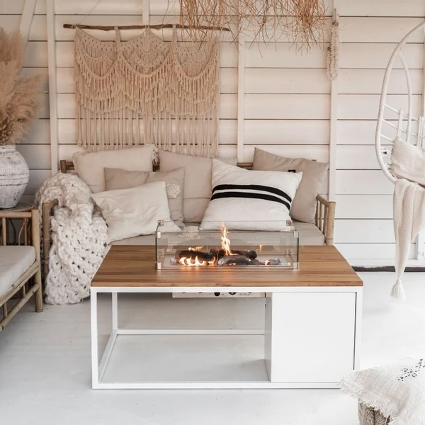 Deze vuurtafel heeft een mooi wit aluminium frame met een prachtige teakhouten tafelblad. Zo´n wit frame past super goed bij een modern tuininterieur. Nu heb je alleen nog een gasfles nodig om jouw vuurtafel in vuur en vlam te zetten! Niet letterlijk dan hé, dat zou zonde zijn. Met een 5 kg gasfles steek je jouw vuurtafel aan. Die gasfles verwerk je bovendien makkelijk in het mooie design van deze Cosiloft tafel, zodat de fles niet teveel opvalt.