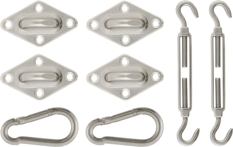 Voor een optimale levensduur en stevige bevestiging is het belangrijk om je Livin’outdoor schaduwdoek goed te bevestigen. Met deze bevestigingsset speciaal gemaakt voor de vierkante schaduwdoeken is dat een fluitje van een cent! De bevestigingsset bestaat uit twee karabijnhaken, twee spanners en vier platen met oog.